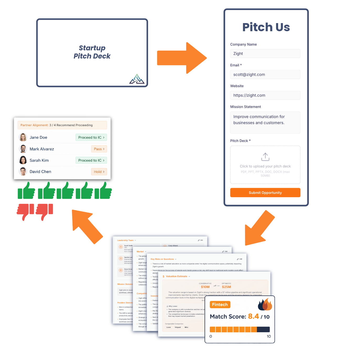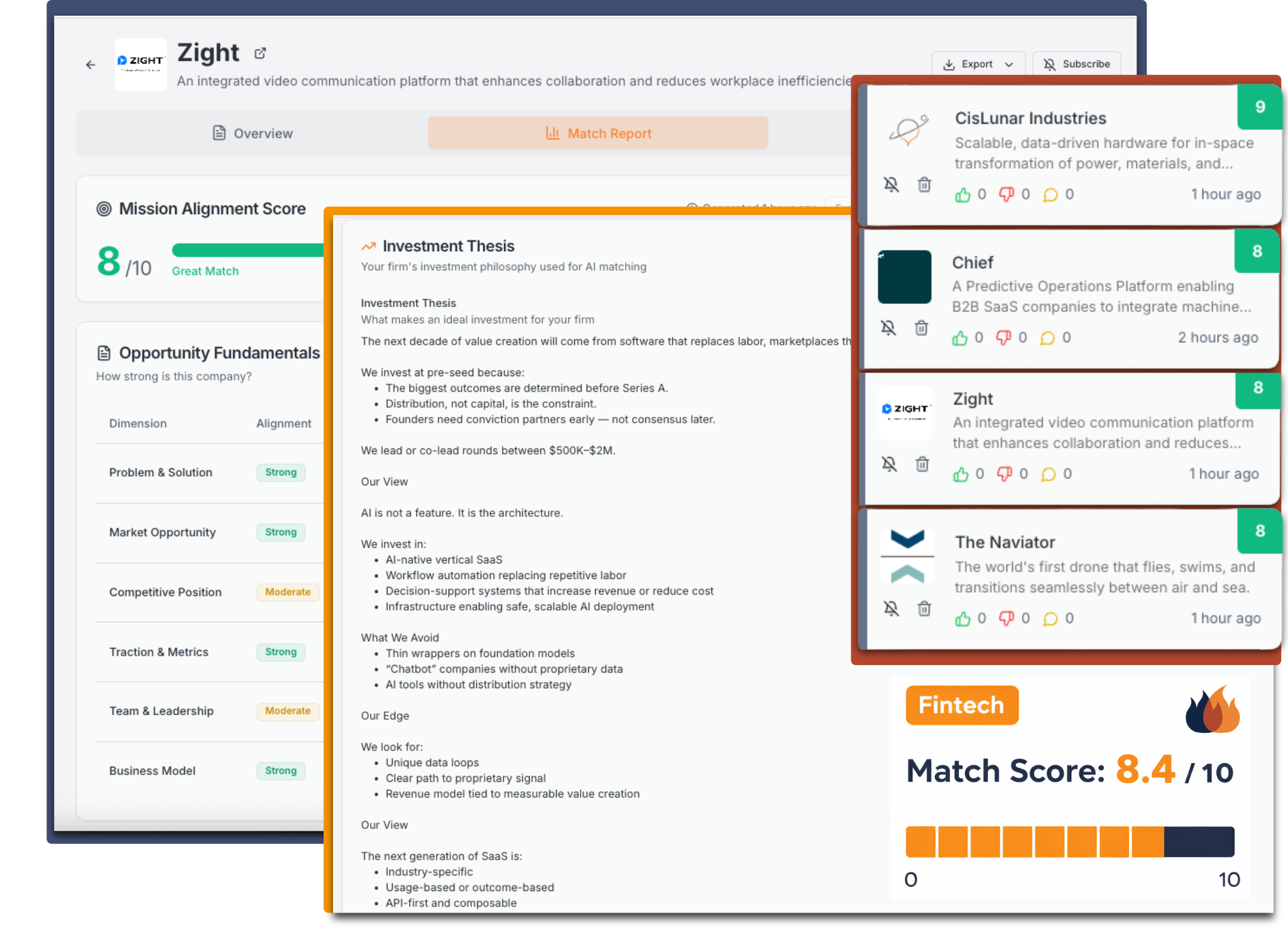 Define your VC thesis, criteria, and investment history. Our AI crafts a match score for each pitch, analyzing your investment history, deck content, and investment criteria.